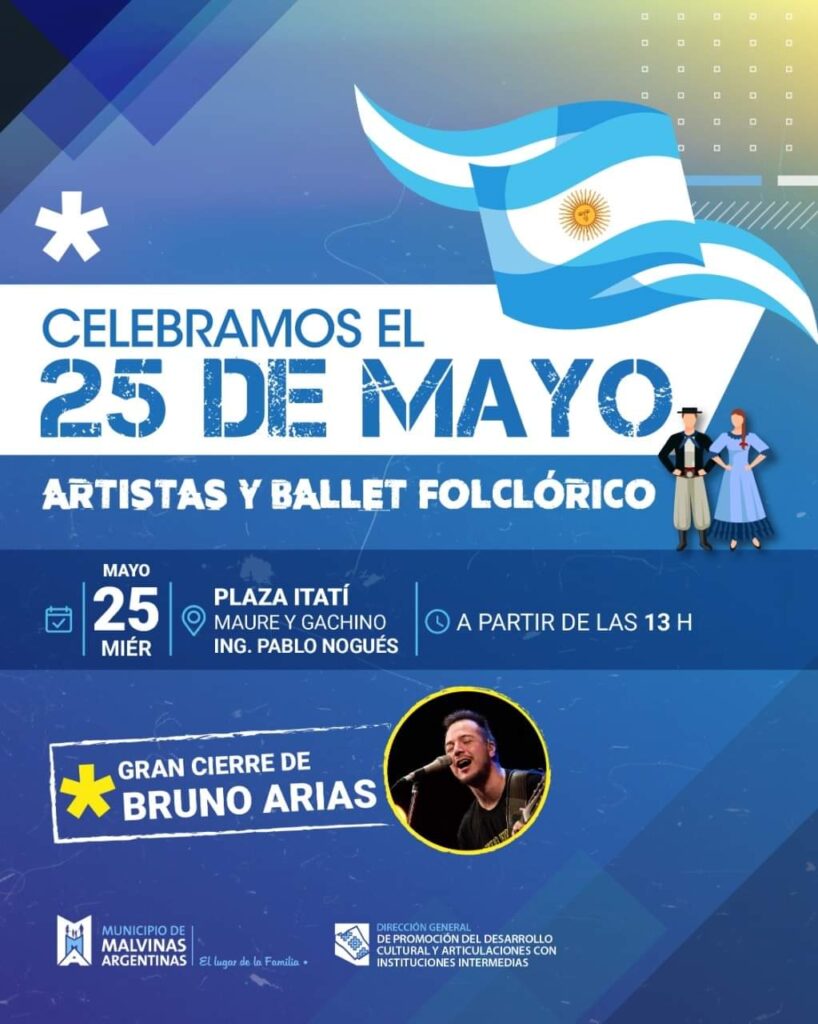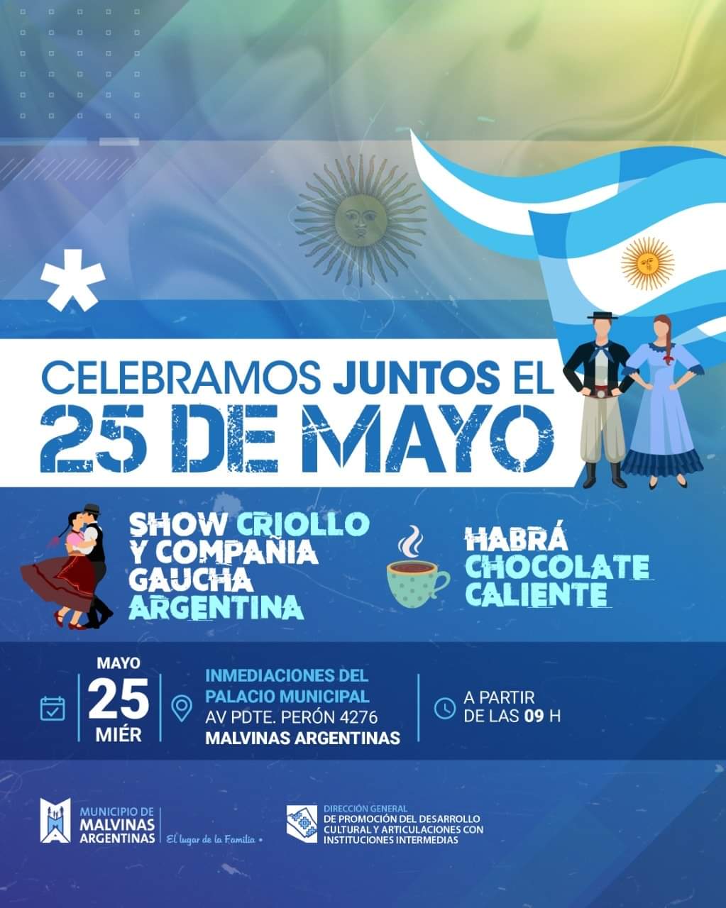 El 25 de mayo es una de las fechas patrias más importantes en la República Argentina, día en que se conmemora la Revolución de Mayo. Para celebrar, el municipio de Malvinas Argentinas preparó para este año diferentes espectáculos culturales que tendrán lugar en tres puntos de la comuna. Ellos son: las inmediaciones del Palacio Municipal, la Plaza Itatí, y en la CCA (Casa Cultura y Arte).