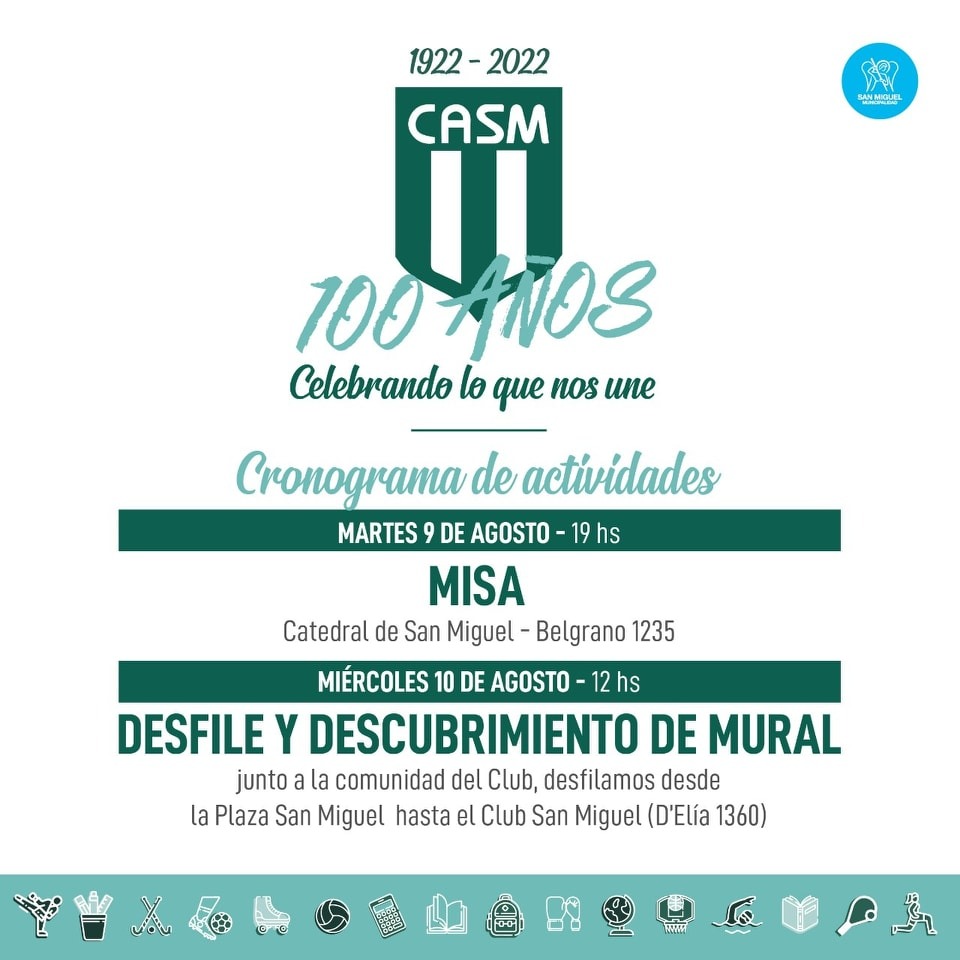 El Club Atlético San Miguel (CASM) cumplió 100 años el domingo 7 de agosto y durante esta semana realiza distintas actividades para conmemorar y celebrar su centenario. Se trata de una emblemática institución social, deportiva y educativa del distrito y la región, por lo que el municipio acompaña los eventos junto a su gran comunidad.