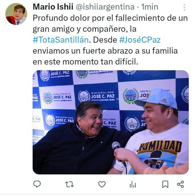 Conocida la noticia de la muerte de Daniel «Tota» Santillan, el intendente de José C. Paz Mario Ishii manifestó su pesar en redes sociales: