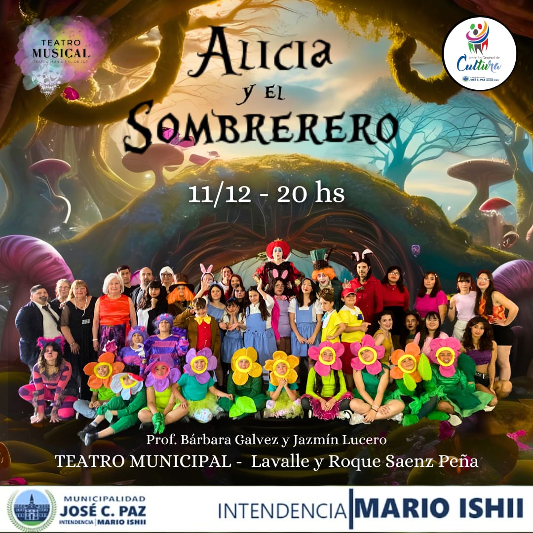 En José C. Paz el próximo miércoles 11/12 a las 20 hs los alumnos y alumnas de los Talleres de Teatro Musical Infantil y el de Jóvenes y adultos, a cargo de las profesoras Barbara Galvez y Jazmin Lucero y la colaboración del Elenco Estable de Teatro de la Dirección de Cultura presentan su cierre de año con una obra mágica: Alicia y el sombrerero.