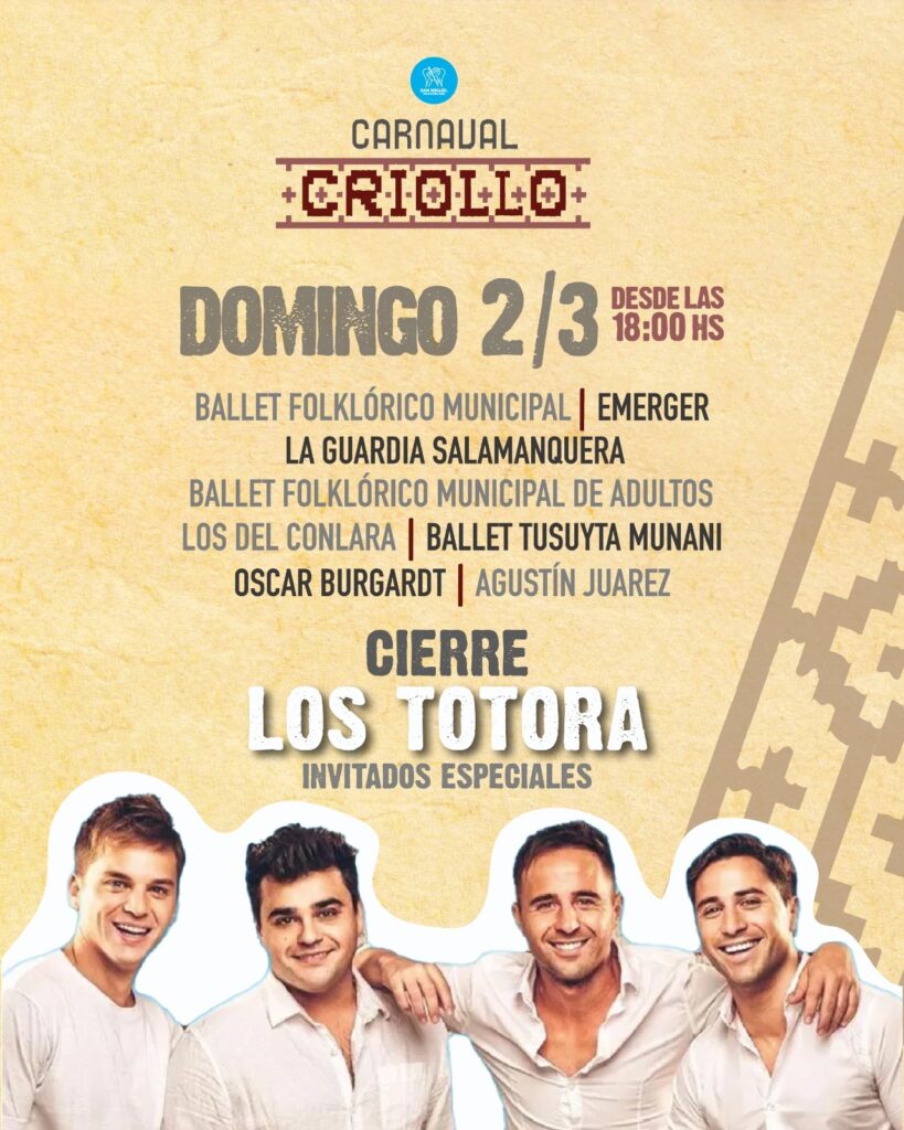 El Carnaval Criollo contará con la participación especial de Leandro Lovato, Los Totora y Lázaro Caballero, entre otros destacados artistas nacionales y de toda la región, como el Ballet Folclórico Municipal, Los de Salta, Agustín Juárez, Los Colorados, Brutal, Los Caseros y Juanjo Abregú, que se presentarán en el emblemático escenario donde cada año se realiza este histórico festival.