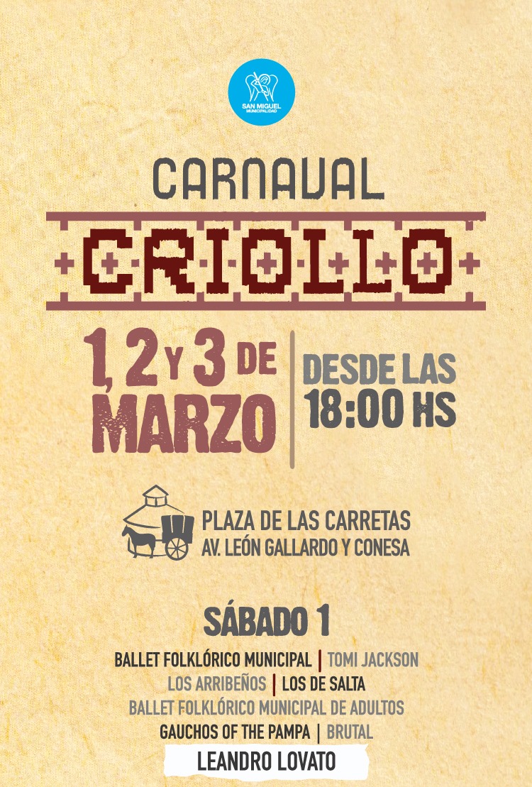 La Municipalidad de San Miguel se prepara para el tradicional Carnaval Criollo, un evento folclórico con un fuerte sentido de pertenencia local. Se realizará el sábado 1, domingo 2 y lunes 3 de marzo, en la Plaza de las Carretas.