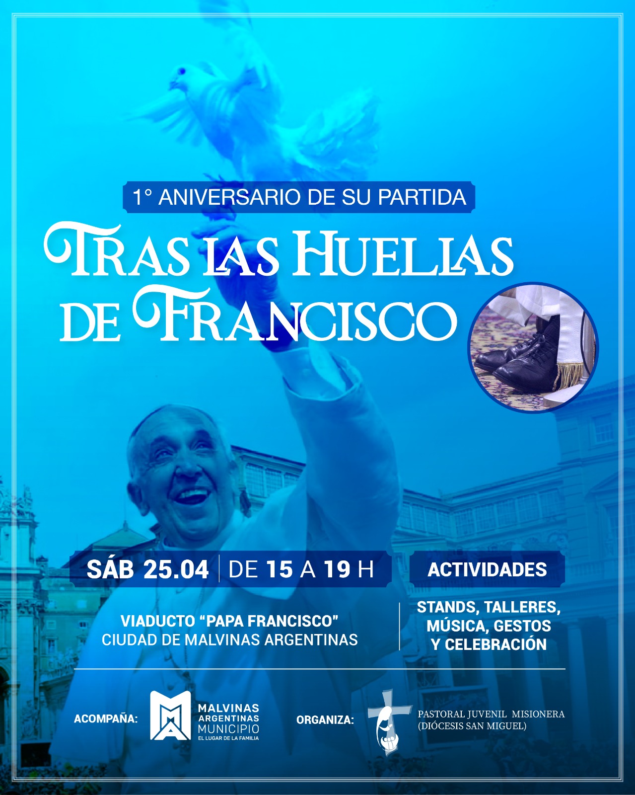 En el marco del primer aniversario de la partida del Papa Francisco, Malvinas Argentinas y su comunidad lo recordarán con un encuentro homenaje titulado “Tras las huellas de Francisco”. La actividad se realizará este sábado 25 de abril, de 15 a 19 horas, en el viaducto que lleva su nombre, entre las calles Suiza e Ing. Huergo.