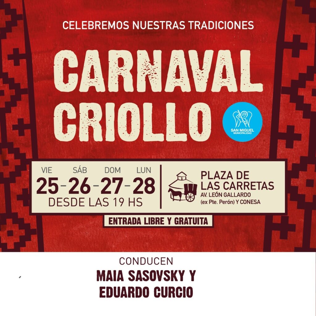 San Miguel se prepara para la 7ma edición de su Carnaval Criollo, con cuatro jornadas que se desarrollarán del viernes 25 al lunes 28 de febrero, a partir de las 19hs, en la Plaza de las Carretas de Muñiz, una de las más emblemáticas de la región y escenario de cientos de artistas locales.