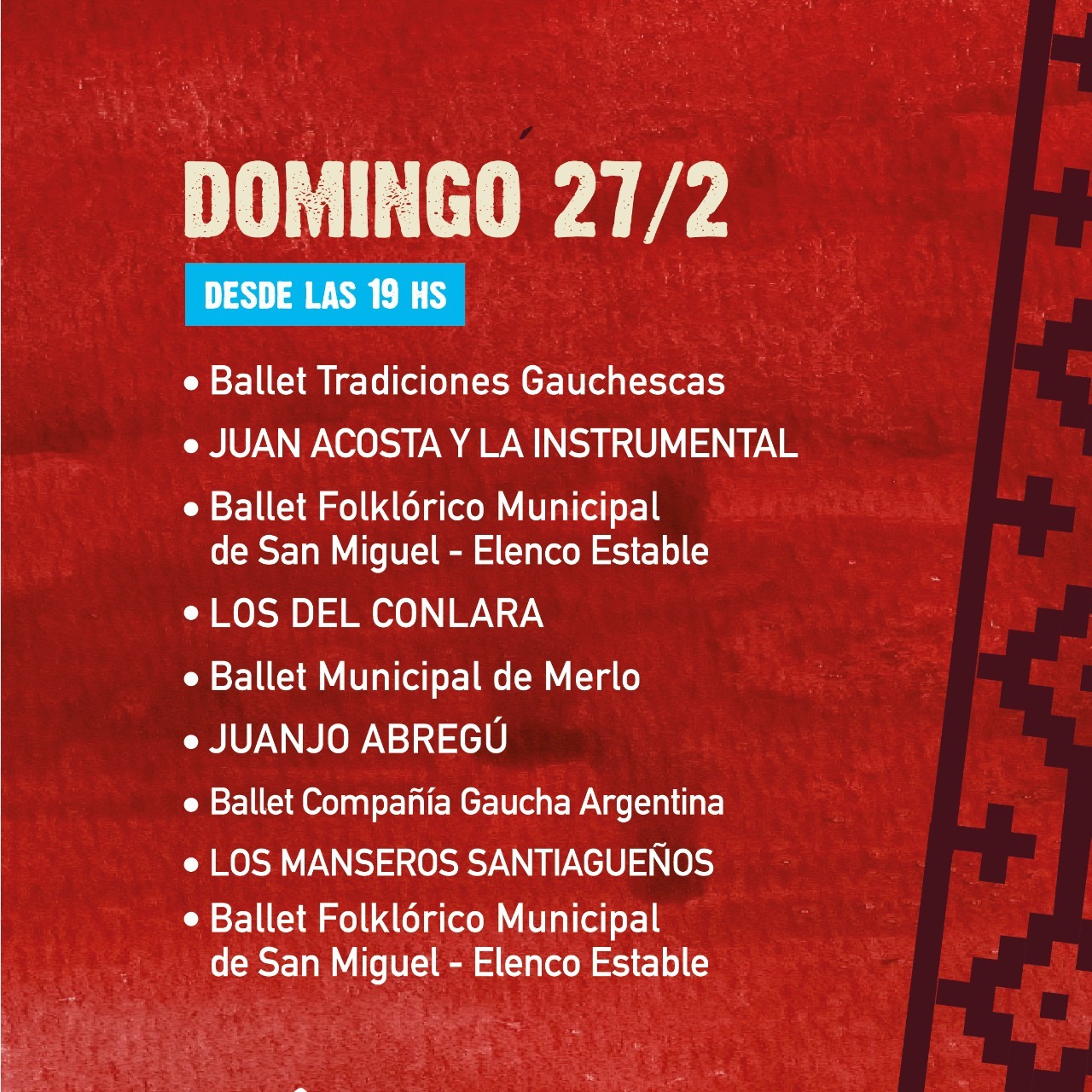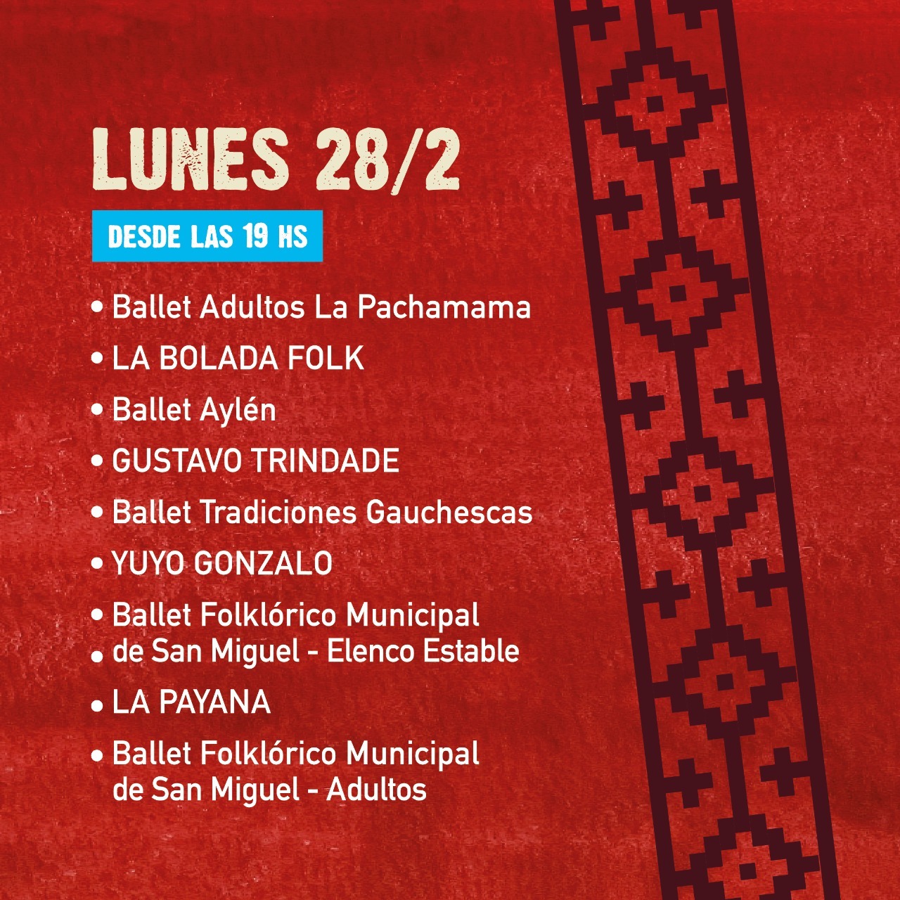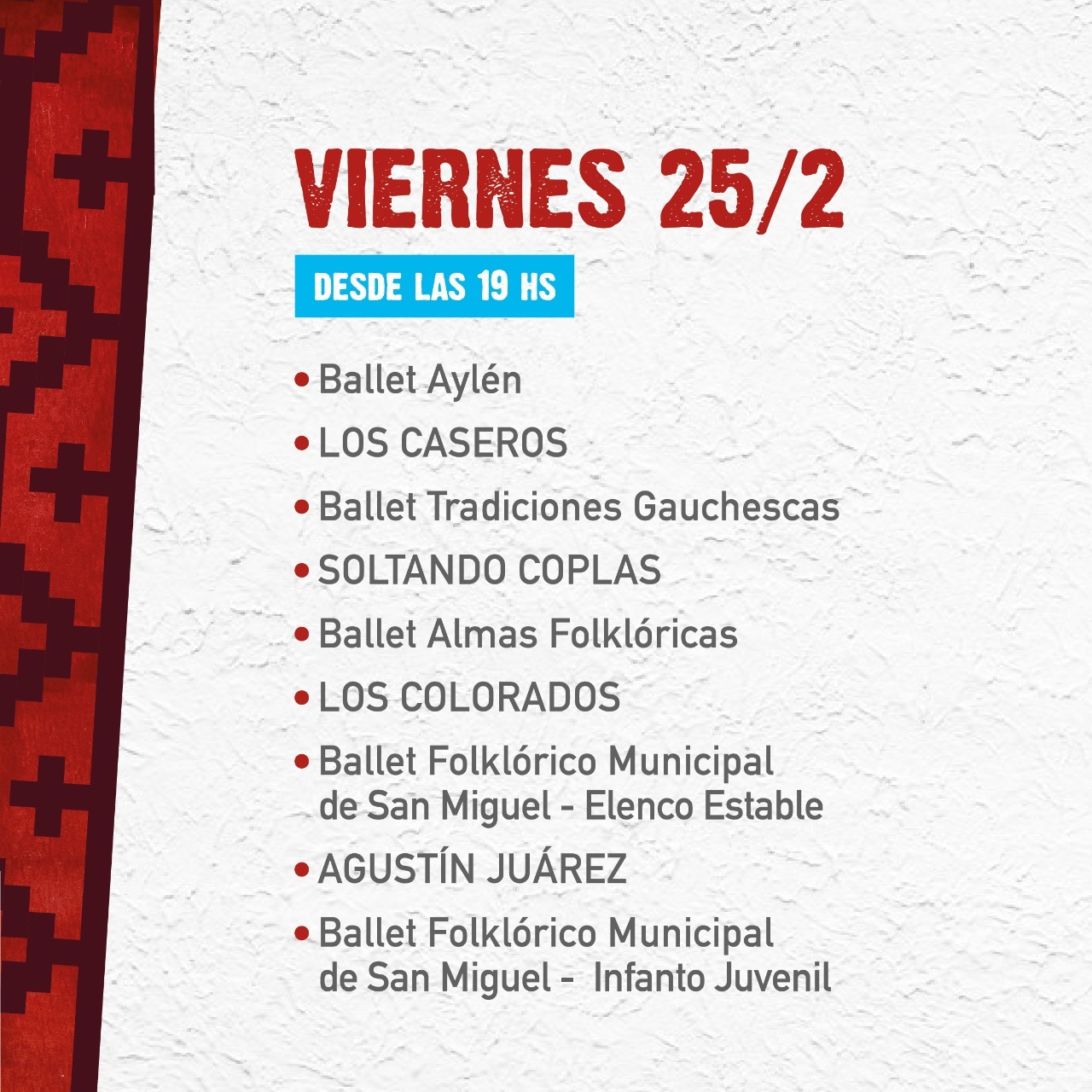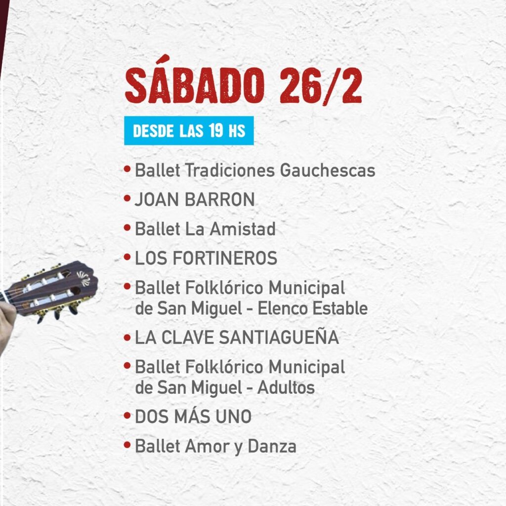 Estarán presentes el Ballet Folklórico Municipal de San Miguel, el de Merlo, Ballet Tradiciones Gauchescas, Ballet Almas Folklóricas, Ballet La Amistad, Ballet Aylén, Los Colorados, Soltando Coplas, La Payana, Los Fortineros, Agustín Juárez y Juanjo Abregú, entre otros artistas de la región.