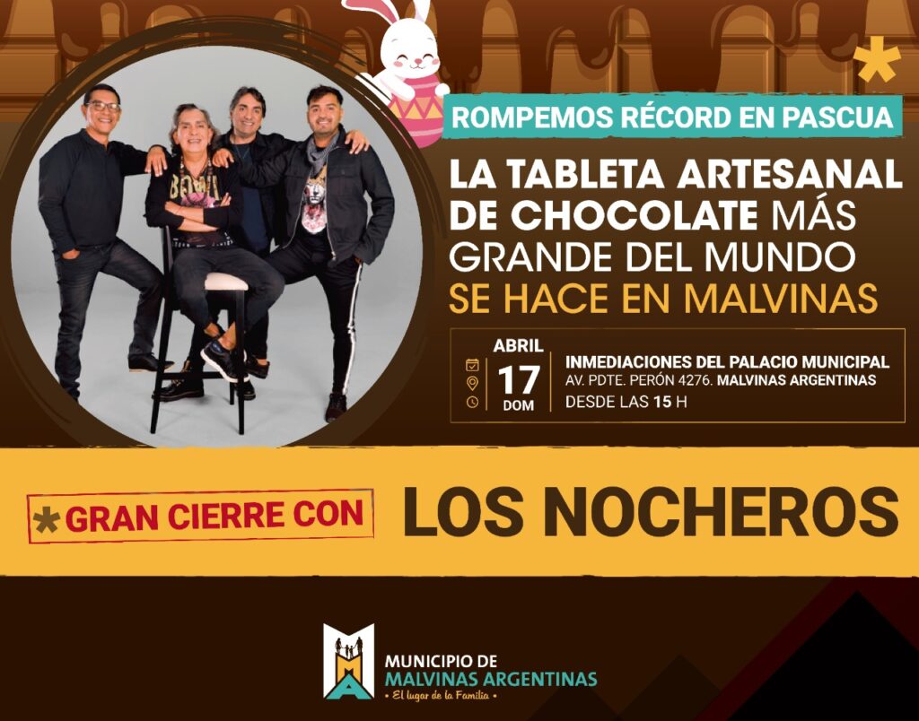 Malvinas Argentinas se prepara para compartir esta pieza de chocolate que romperá un récord mundial. El proceso de elaboración podrá visitarse los días 14, 15, 16 y 17 de abril. El domingo será el gran día, donde se podrá degustar la pieza, y disfrutar del gran show de “Los Nocheros”.